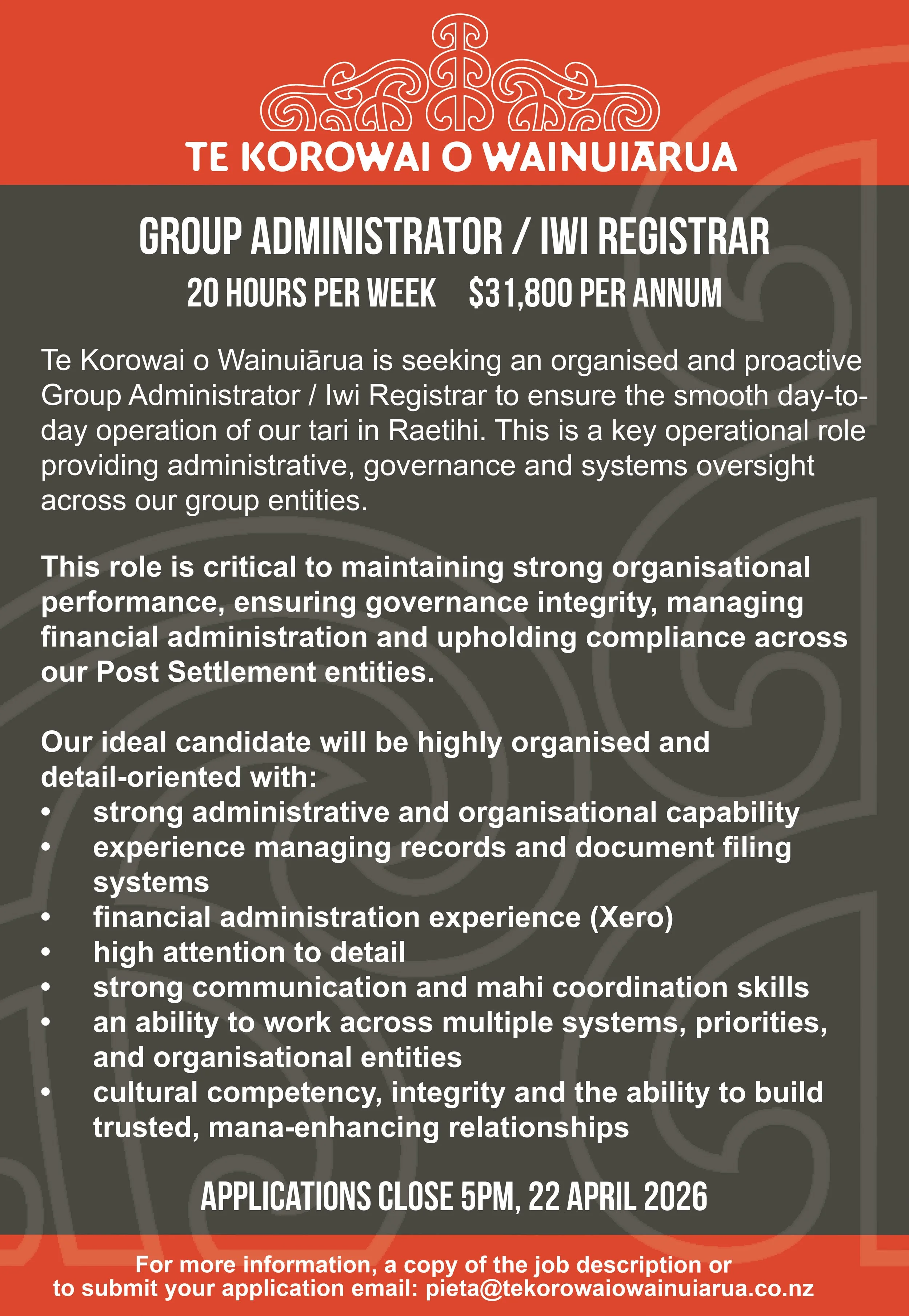 Te Korowai o Wainuiārua is seeking an organised and proactive Group Administrator / Iwi Registrar to ensure the smooth day-to-day operation of our tari in Raetihi. This is a key operational role providing administrative, governance and systems oversight across our group entities.